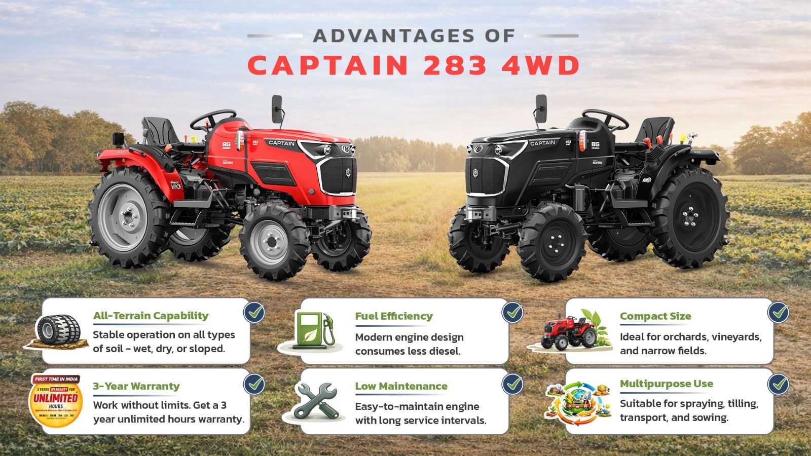 Captain Tractors 283 4WD improves productivity by saving fuel, time, and labour. Its reliable engine helps complete ploughing and cultivation faster. Farmers benefit from reduced operating costs due to better mileage and low maintenance.